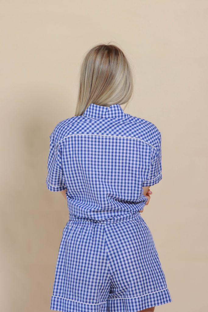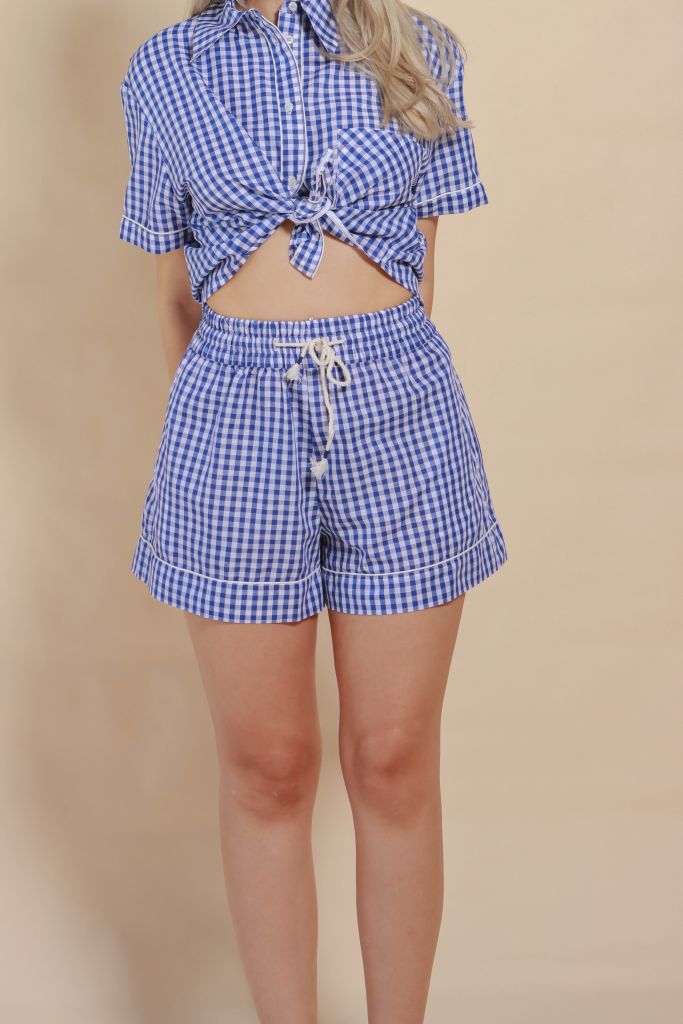 "Short à motif vichy bleu et blanc en 100% coton.".