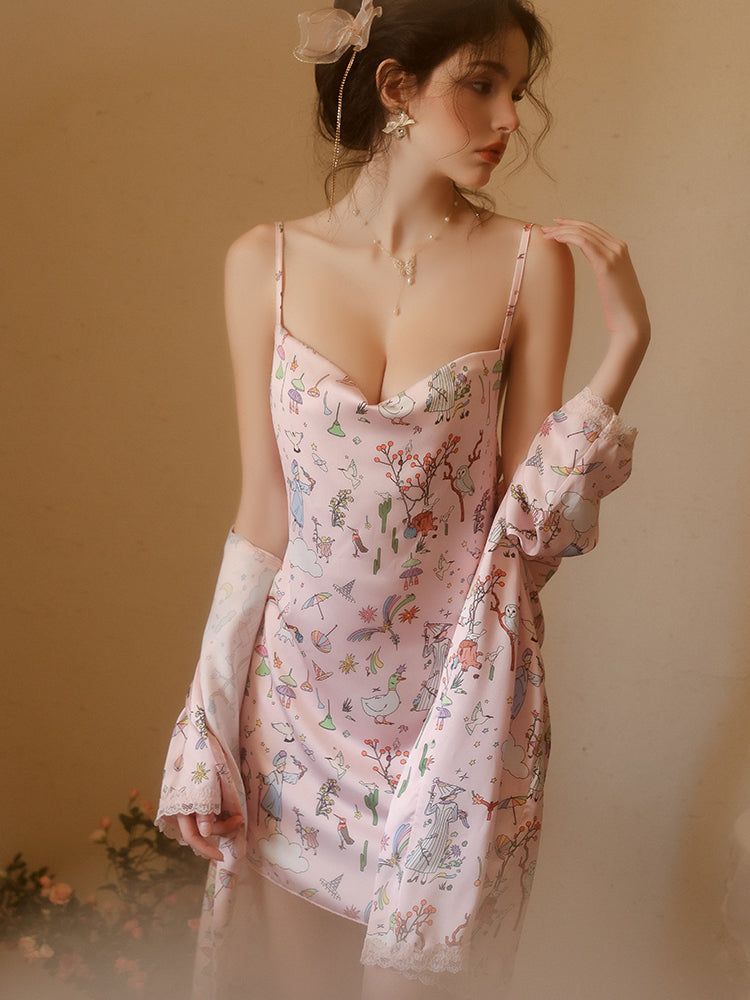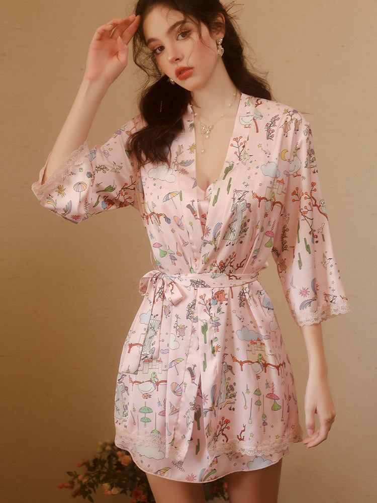 Détails : imprimé fantaisie coloré, ourlets décorés de dentelle fine, robe fluide assortie avec manches en dentelle délicate.