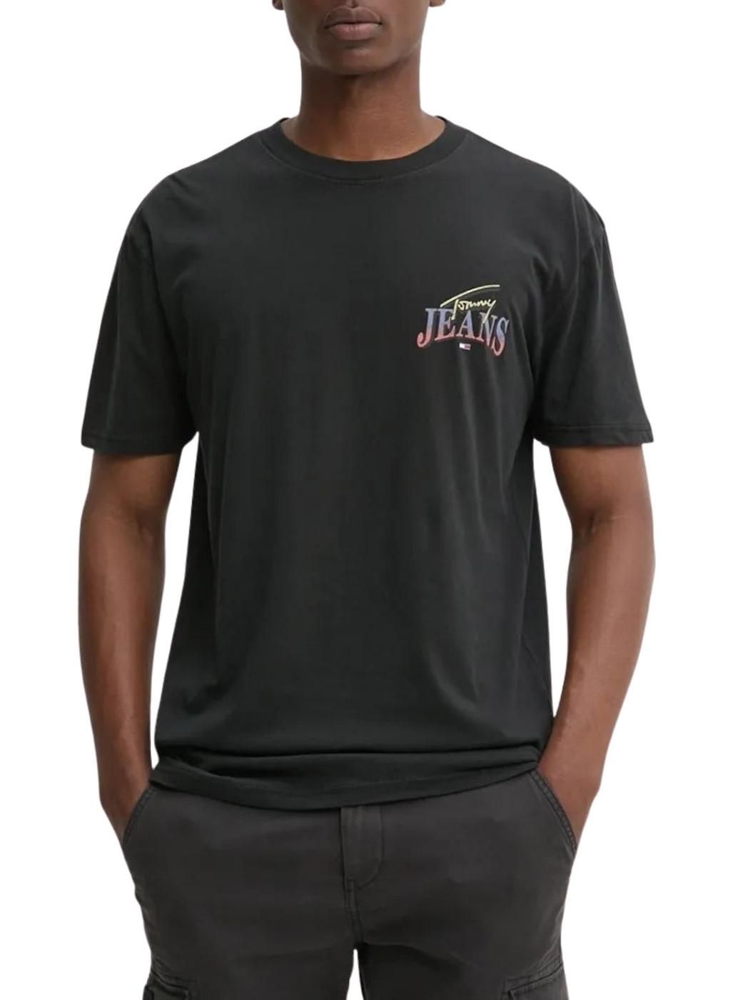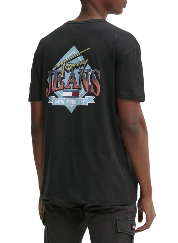 T-shirt Tommy Jeans. Logo de Tommy Jeans en grand sur le dos. Couleur noir. Col rond. Manches courtes. Logo de Tommy Jeans sur la poitrine. Coupe régulière. Le modèle porte la taille M.