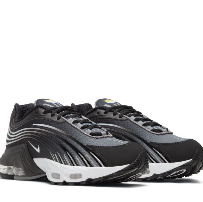 Apres avoir ressuscite l' Air Max Plus 2 dans son design original aux couleurs vives , Nike revient desormais e la silhouette pour un design beaucoup plus sombre. Comme pour toutes les Air Max Plus 2, le nouveau coloris presente un degrade bicolore sur toute la tige, passant cette fois du e gris fume e e l'avant du pied au noir vers le talon. Pour completer ce coloris plus sombre, Nike a egalement habille le contrefort exagere et les lignes ondulees de la silhouette dans des tons noirs et gris similaires. Ce design est compense par une section de semelle exterieure blanche et des details subtils e Reflect Silver e sur le cete de chaque sneaker. Le logo TN jaune audacieux de Nike apparaet egalement sur le talon et la languette de la sneaker.