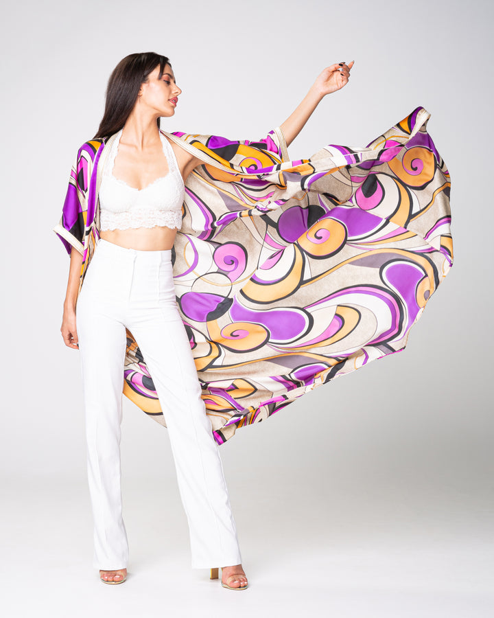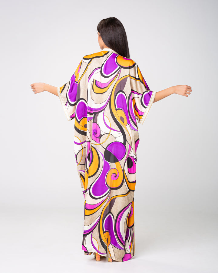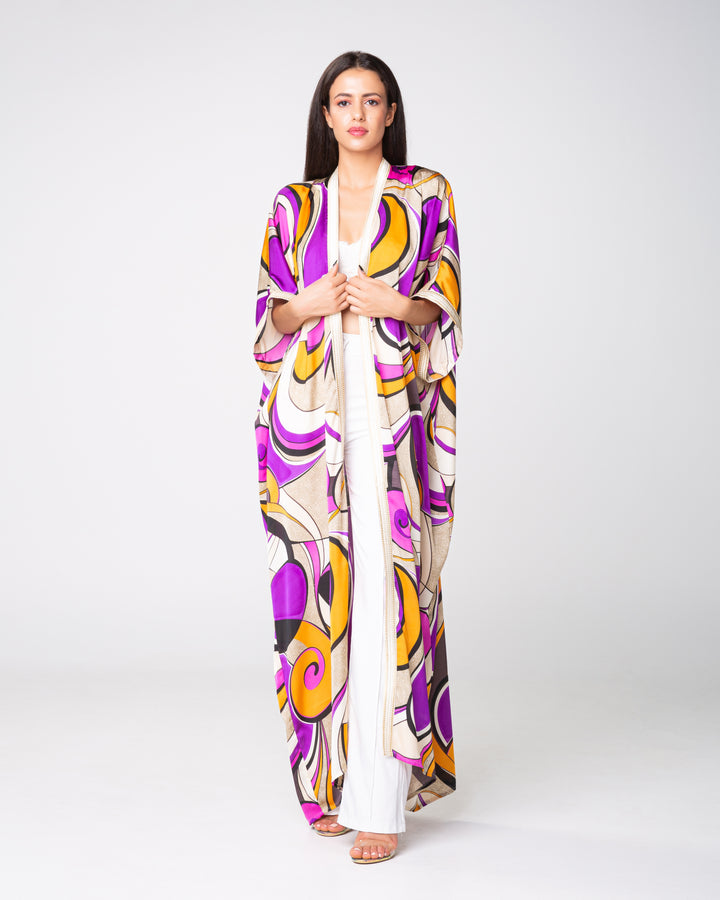 Un kimono en soie imprimée mauve bordé d'un galon blanc tout au long du devant et des manches